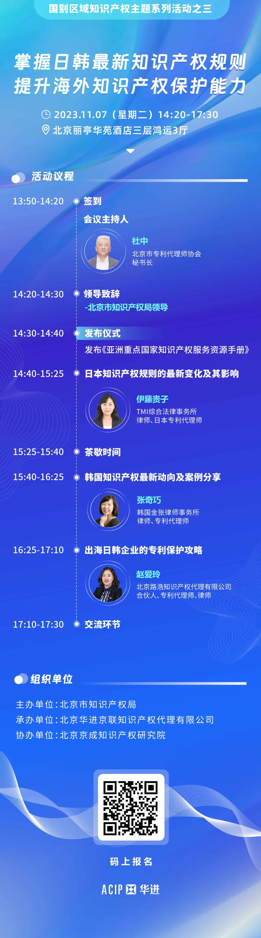 為推動(dòng)北京市知識(shí)產(chǎn)權(quán)國際化發(fā)展,助力北京市創(chuàng)新主體“走出去”,增強(qiáng)創(chuàng)新主體海外知識(shí)產(chǎn)權(quán)保護(hù)意識(shí),由北京市知識(shí)產(chǎn)權(quán)局主辦、北京華進(jìn)京聯(lián)知識(shí)產(chǎn)權(quán)代理有限公司承辦、北京京成知識(shí)產(chǎn)權(quán)研究院協(xié)辦的推廣WIPO國際服務(wù)體系以及重點(diǎn)國家/區(qū)域知識(shí)產(chǎn)權(quán)主題系列活動(dòng)于8月至11月在北京陸續(xù)舉行。北京麗亭華苑酒店三層鴻運(yùn)3廳